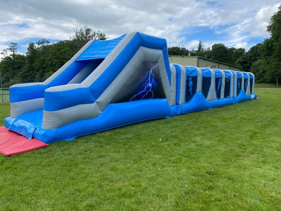 20 meter assault course with slide, suitable for all ages. Great for Fun days, Team building and school events.