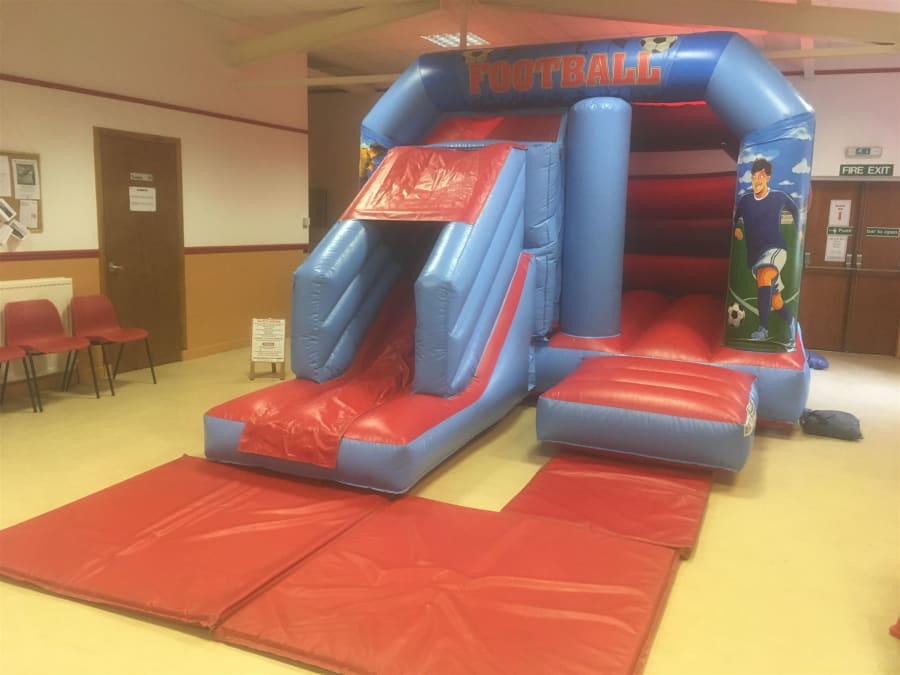 Football themed bouncy castle with attached slide from Noon Entertainments