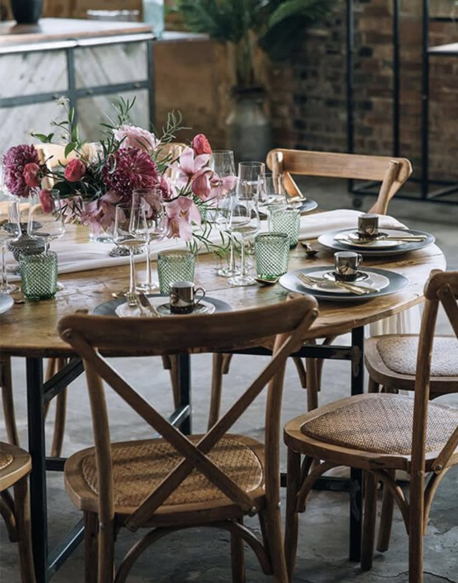 Rustic cross back chairs hire.