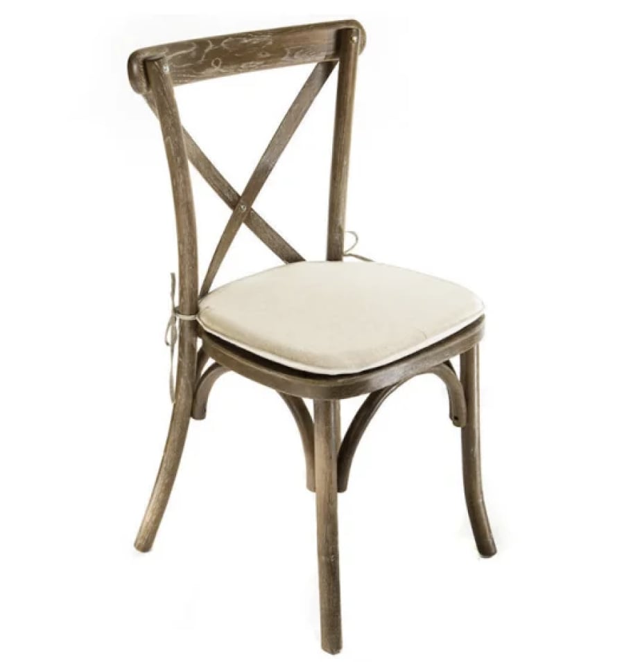 🌿 Elevate your special occasion with our exquisite Rustic Cross Back Chairs with Ivory Cushions, perfect for infusing charm and elegance into your wedding or event. These chairs are not just seating solutions; they're a statement of style and sophistication that will captivate your guests and complement your rustic or countryside theme.